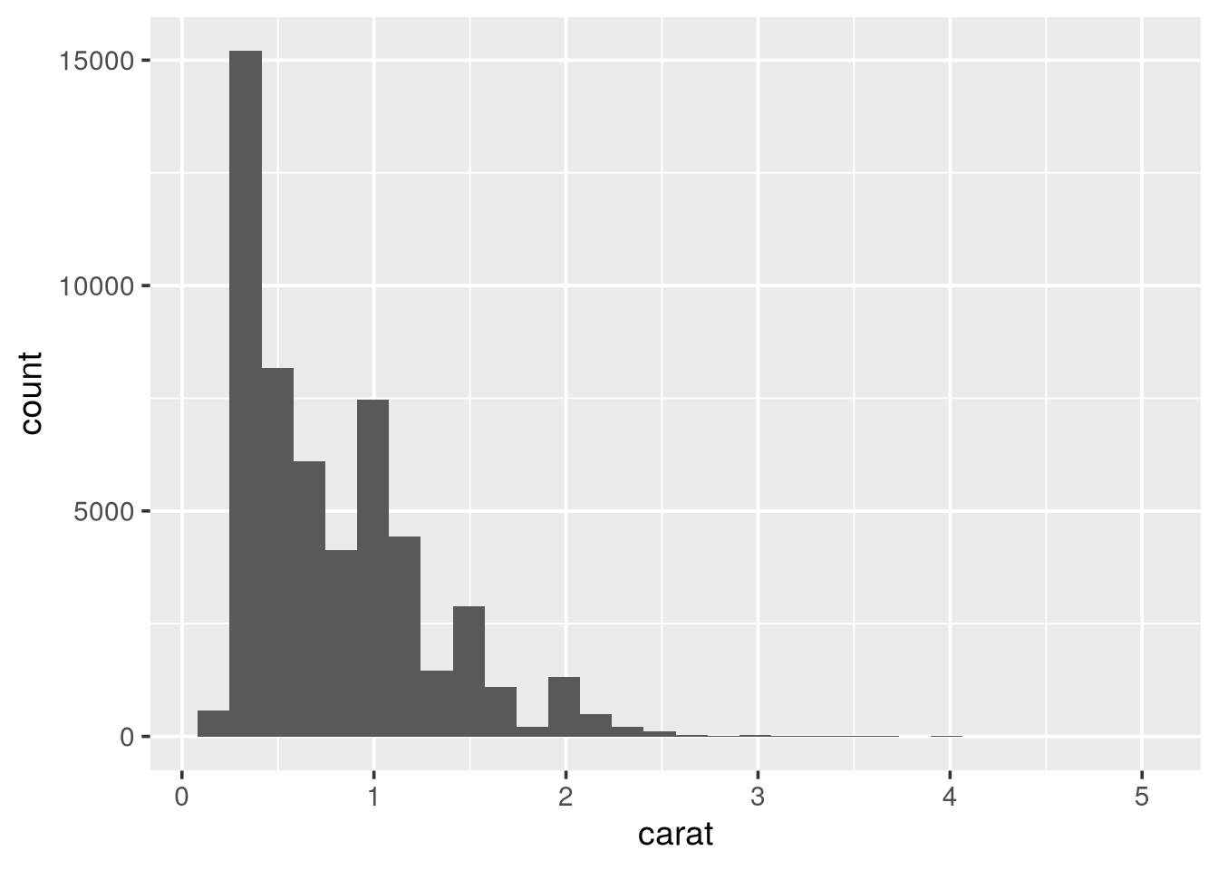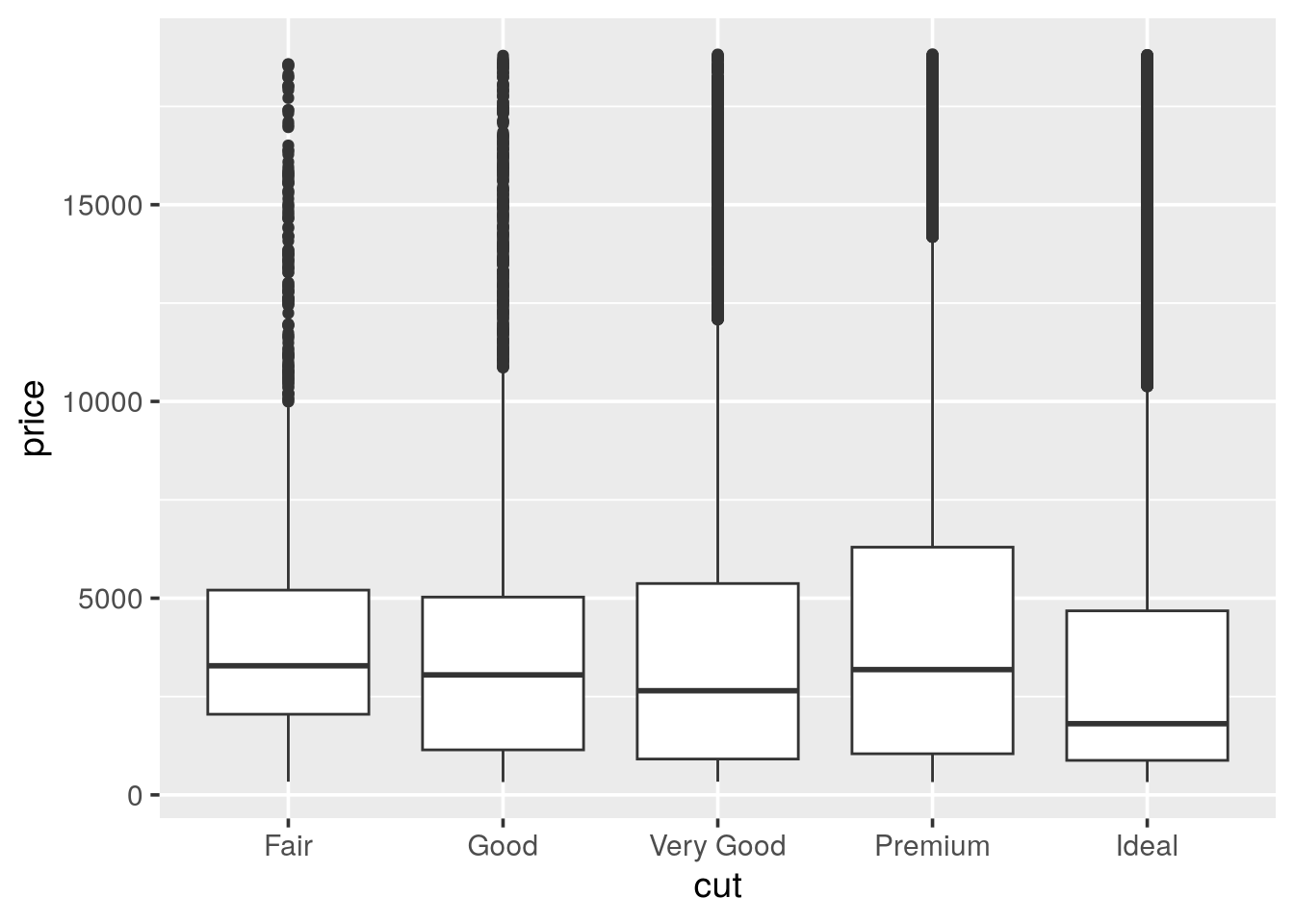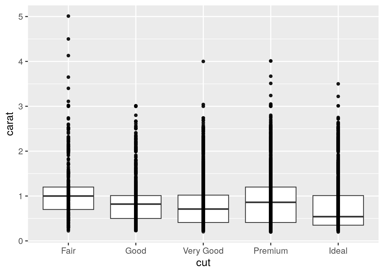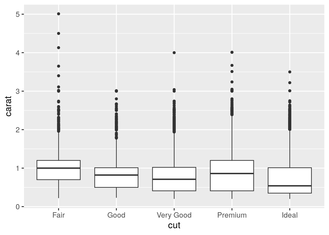ggplot(diamonds) + geom_boxplot(aes(x = cut, y = carat))By using ggplot() we are now starting to use the layering approach