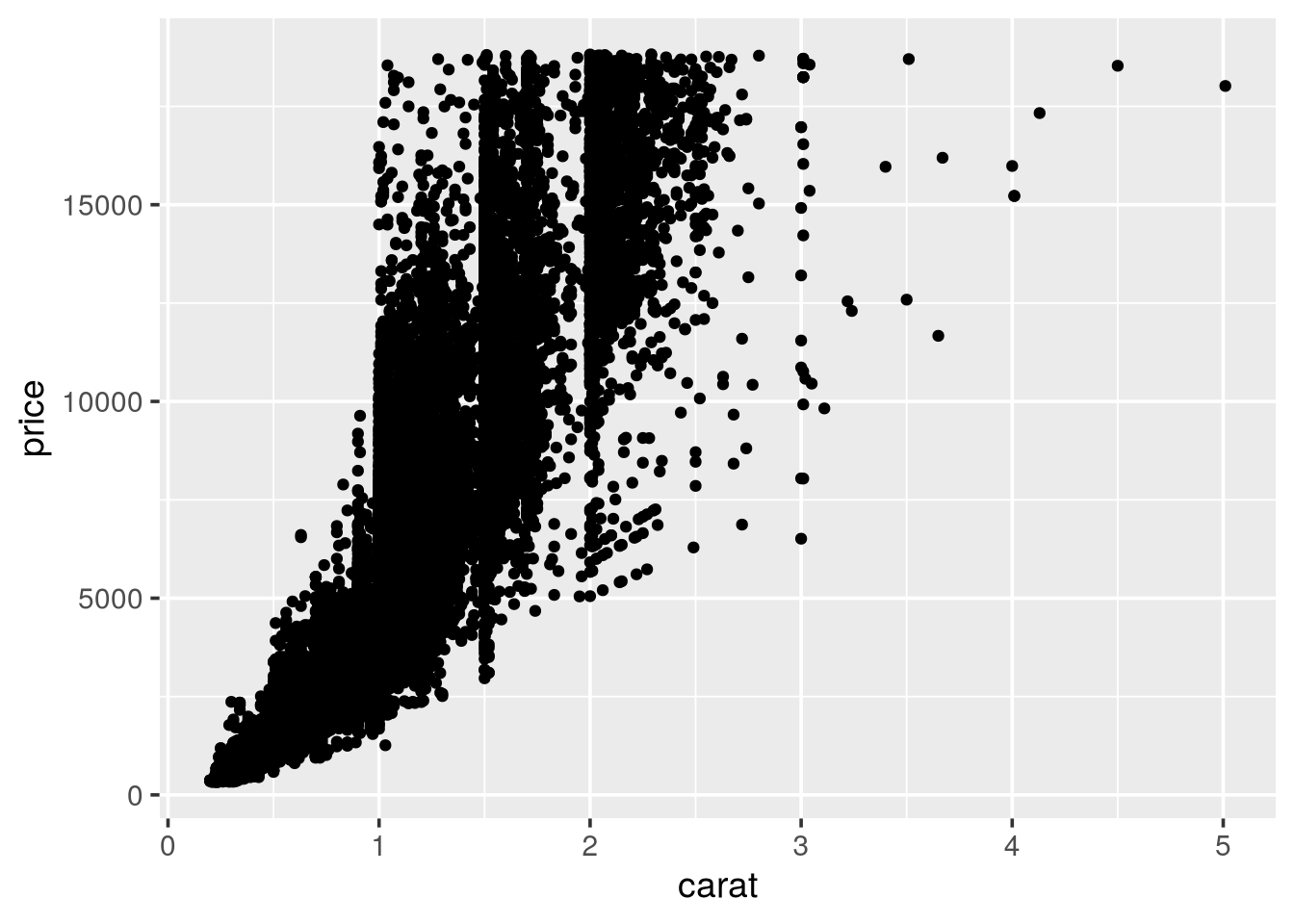 First we will recreate some of the graphs we have already seen, so that you spot the subtle differences in code. To produce the scatter plot of carat vs price: