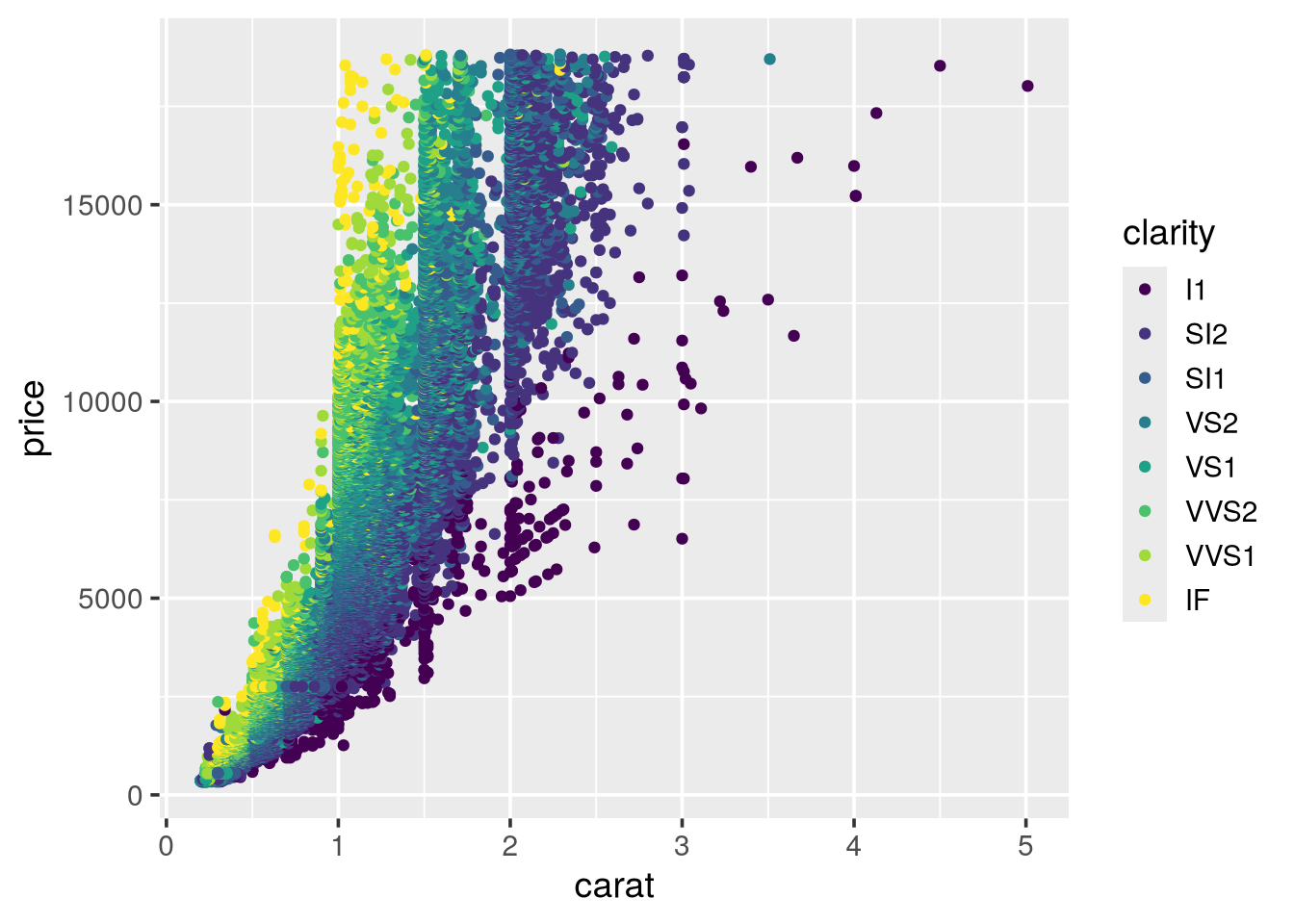 geom_point(aes(x = carat, y = price, colour = clarity)) +