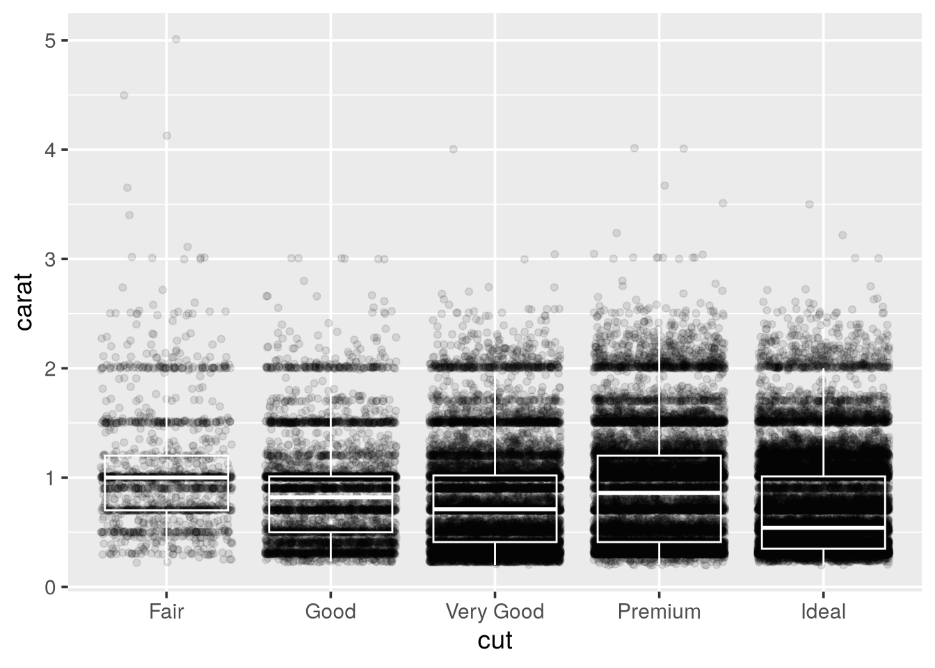 geom_boxplot(aes(x = cut, y = carat), colour = "white",